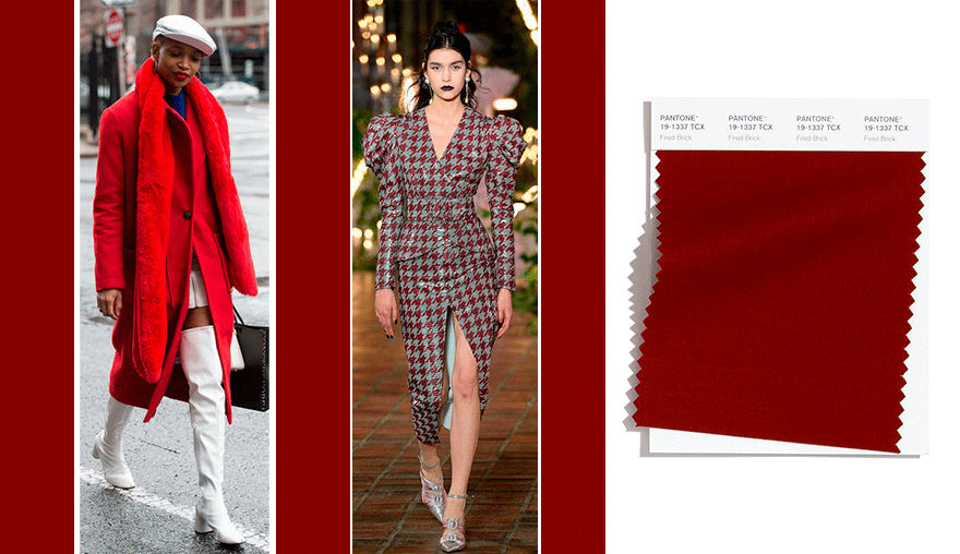 Сильный и крепкий цвет, отвечающий за прагматизм и весомость. Хорошо сочетается с мятным цветом. Rodarte представили лаковый костюм в ломаную клетку из двух элементов: пиджака с расширенными рукавами и четко выраженной талией и обтягивающей юбки с разрезом. Если не боишься экспериментов, то можешь попробовать образ с использованием цвета обожженного кирпича как основного, надевая его с оттенками самба, классическим синим и белым.