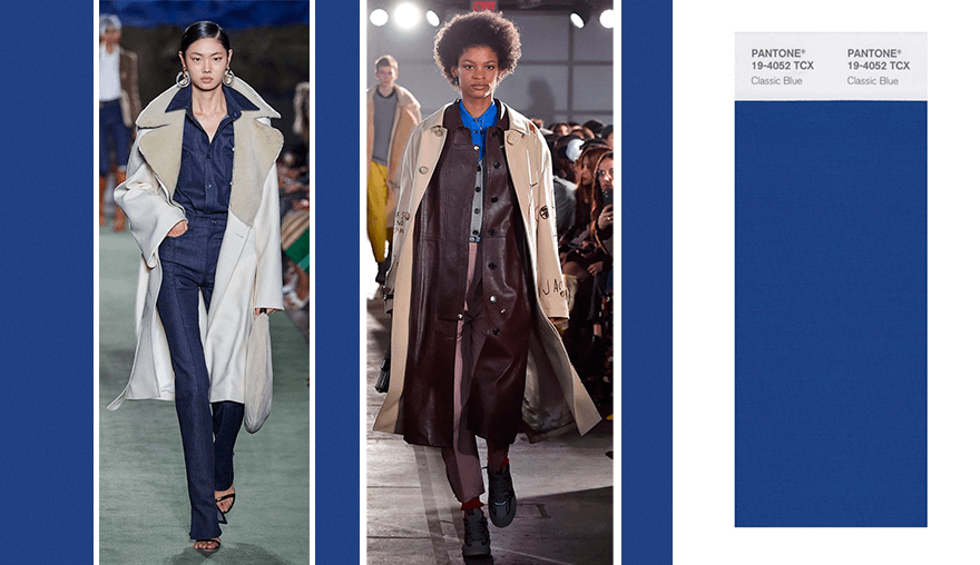 Эйсман объяснила, что он напоминает о бескрайнем небе, снижает тревожность и отвечает за спокойствие. Классический синий — благородный оттенок, поэтому превосходно смотрится и сам по себе, и в сочетании с другими цветами. Даже выступая дополняющим компонентом, например как рубашка в одном из образов Coach, он притягивает внимание. Также он естественно смотрится как главная деталь образа. Это продемонстрировал Brandon Maxwell, представив денимовый комбинезон классического синего цвета в сочетании с кремовым тренчем.
