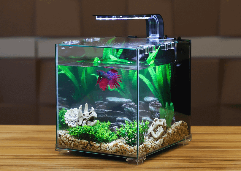 Для комфортного и безопасного проживания рыбкам нужен стеклянный аквариум. В качестве первого аквариума лучше выбрать компактную модель, так как за большим резервуаром сложнее ухаживать и это может оказаться не по силам ребенку. В миниатюрном аквариуме отлично приживутся яркий петушок или стайка игривых гуппи, а еще он не займет много места и легко впишется в детскую.