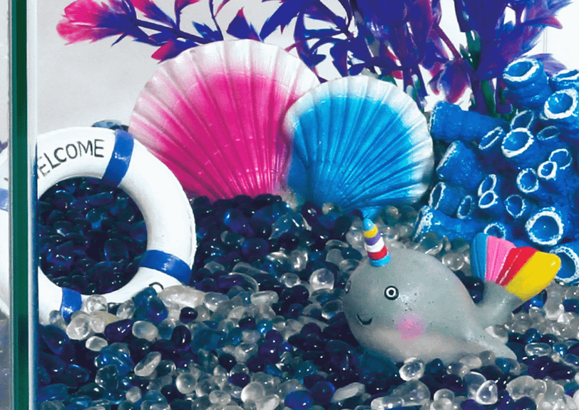 Украсить аквариум можно как угодно. Например, можешь воссоздать привычную среду обитания рыбок. Но еще лучше, раз уж аквариум детский, подключить к оформлению ребенка и дать ему проявить фантазию. Например, пусть повторит морское дно из любимых мультиков или с помощью набора декора самостоятельно придумает сюжет приключений в подводном городке.