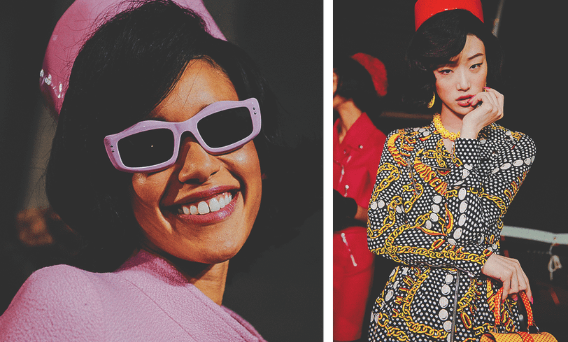 Дизайнер Moschino Джереми Скотт пошел другим путем и показал свое видение Джеки О и Мэрилин Монро в форме андроидов. Боди-арт, атласные вечерние платья, серебряные блестки.