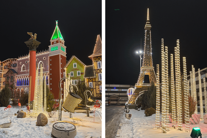 А еще кампанилу Святого Марко, Биг-Бен, Исаакиевский Собор, фрагмент Великой Китайской стены и балкон Джульетты в Вероне — уменьшенные копии более 40 мировых достопримечательностей встретят тебя на улочках сказочного города. И все в ослепительной иллюминации и в новогоднем убранстве!