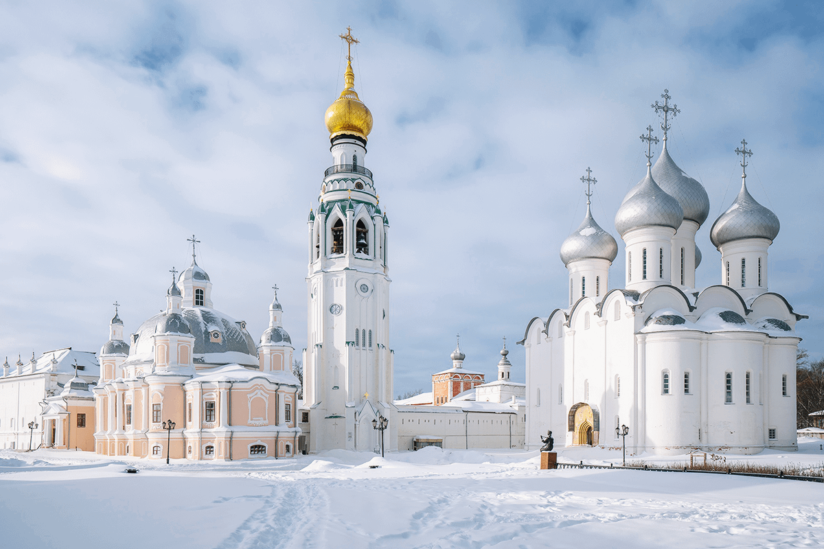 Один из главных символов Вологды, его построили в XVI веке. Этот кирпичный храм с пятью куполами славится своими фресками и иконостасом XVIII века. На колокольне собора высотой 78,5 метра находится смотровая площадка, с которой открывается панорамный вид на город.