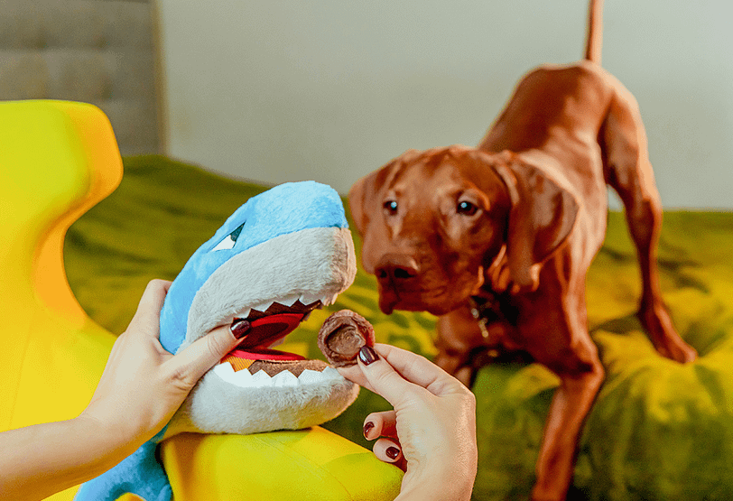 Некоторые игрушки требуют от собаки чуть больше сообразительности. В них лакомство спрятано внутри, но доступ к нему закрыт — питомцу нужно понять, как именно добраться до вкусняшки.