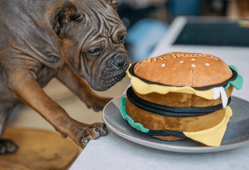 Такой принцип используется в серии игрушек GiGwi TRICK’o’TREATS! (Сладость или Гадость): акуле и гамбургере с нишей для лакомств. Внутри есть карман на липучке, поэтому собаке нужно догадаться, как открыть игрушку.
