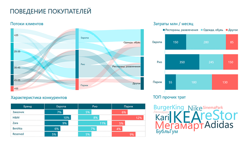 Возникает логичный вопрос: как сделать отчет быстро, красиво и не испытывать затруднений при замене данных? Самый оптимальный, на мой взгляд, ответ — программа Power BI. Ее тоже разработала Microsoft, и по своей сути Power BI является синтезом Power Point и Excel, вобравшем в себя лучшие черты каждого предшественника. Его можно сравнить с iPhone для корпоративной отчетности: меньше кнопок, красиво и удобно. Да, у Power BI есть аналоги, но у них совсем другая логика, которую нужно будет понять. Взять, например, QlikView или Tableau: в них можно получить тот же результат, но разбираться придется намного дольше.