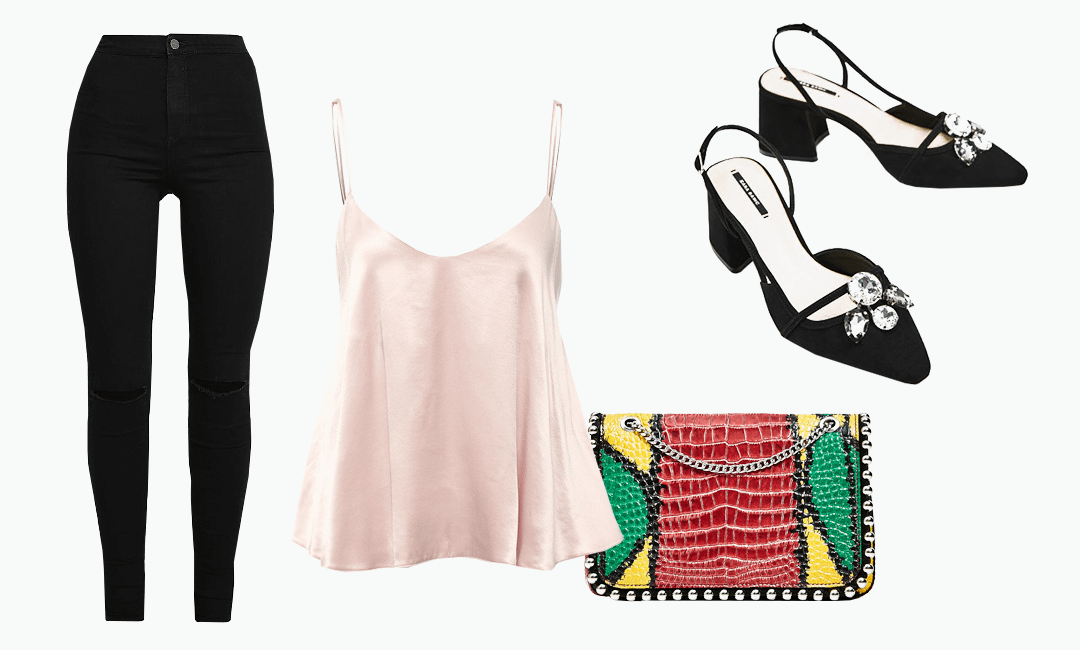 Атласные вещи, даже самых простых фасонов и цветов, добавляют роскоши в любой гардероб. Будь это платье, шарф или блузка, можно больше не переживать — атлас будет привлекать к себе внимание. Мы советуем выбрать самые простые черные джинсы с высокой талией и элегантный атласный топ на тонких бретельках с кружевом или без. В качестве аксессуаров к такому простому образу отлично подойдут туфли с декоративным элементом и яркая сумка через плечо.
