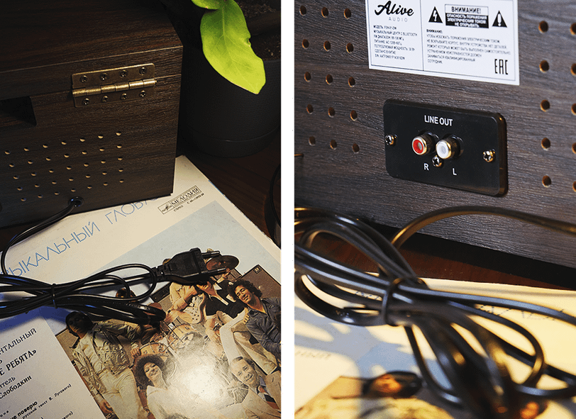 Поверх проигрывателя находится крышка с упором, которая защищает его и пластинки от попадания пыли. Кроме того, в вертушке расположено достаточно разъемов, чтобы было удобно подключать внешнюю акустику.