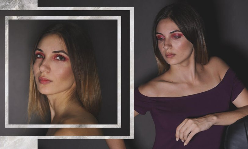 Совет редакции: Мы использовали три вида теней: матовый-красный с персиковым полутоном для основы, сверху яркая малина с перламутром, третий слой — глиттер, точечно в центр века. Губы лучше всего оставить нюдовыми. Можно добавить оттенка — чайная роза, персик. Мы сделали легкое омбре из бежевой и розовой помады с матовым эффектом. Также добавили немного хайлайтера на скулах, носу и над верхней губой.