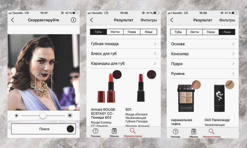 Приложение показывает косметику разных ценовых категорий, так что одним Armani список не ограничивается.