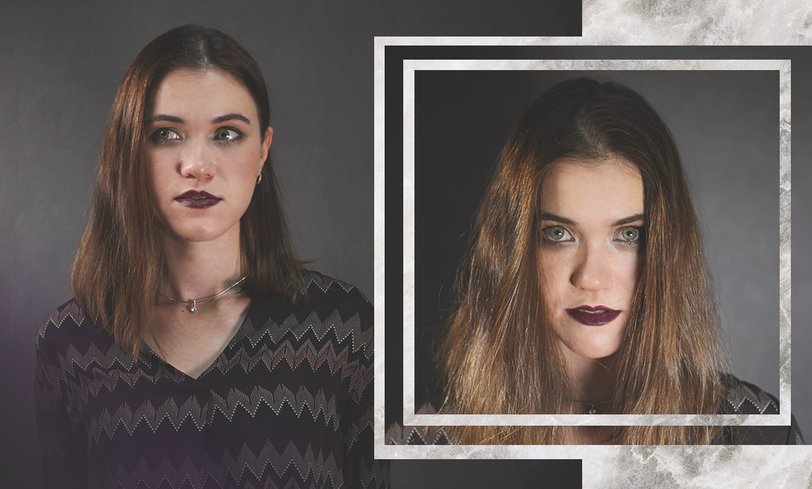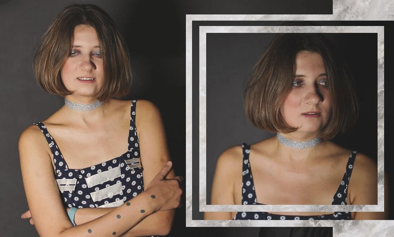 Совет редакции: Темные губы требуют темных бровей! Мы нанесли Юле темно-фиолетовую помаду, и пришлось сделать брови на тон темнее. На глазах очень минималистичное сочетание серебряного, дымчато-серого и черного оттенков.