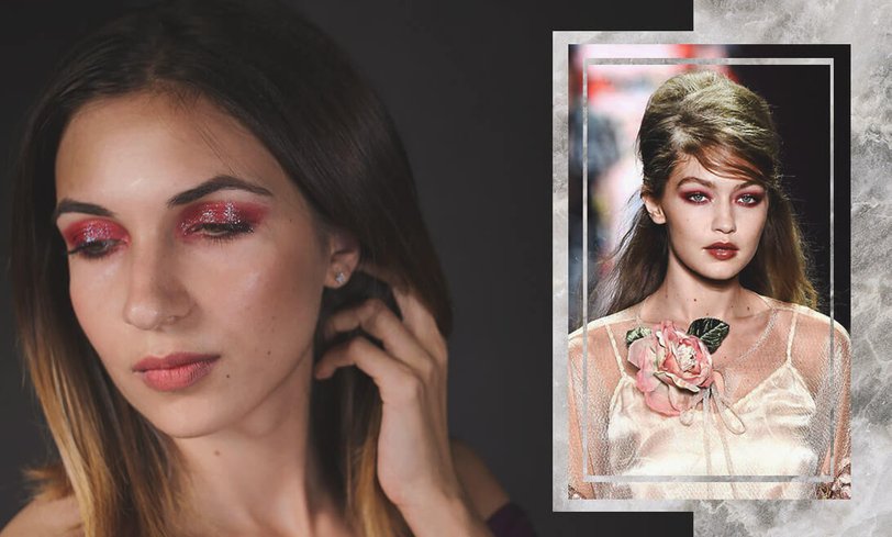 Фуксия в повседневном макияже — это почти как новогодняя резолюция. Очень хочется попробовать, но так сложно подойти к реализации. Когда мне делали данный макияж, я до конца не верила, что мне подойдет. У нас с Джиджи похожий оливковый цвет кожи, и яркие оттенки розового — это способ заставить лицо заиграть новыми красками. Мой любимый момент в создании этого макияжа — глиттер. Мы использовали его для создания объема. Никогда бы не подумала, что я настолько смелая, чтобы носить блестки в течение дня.