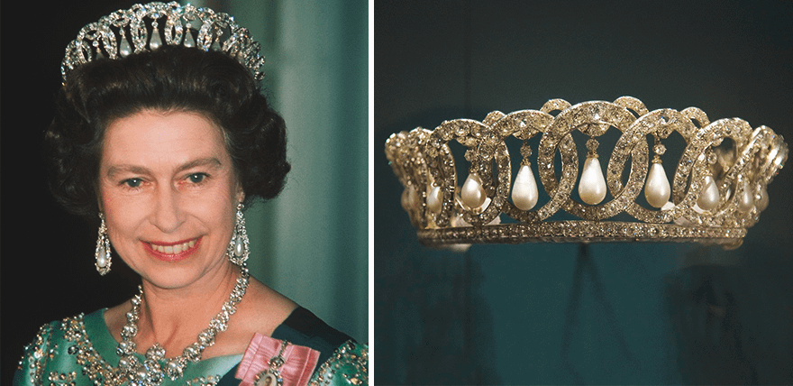Еще одна драгоценность Елизаветы II иностранного происхождения – Владимирская тиара, украшенная бриллиантами и жемчугом. Она была изготовлена в качестве свадебного подарка для княгини Марии Павловны, жены Владимира Александровича — третьего сына императора Александра II.