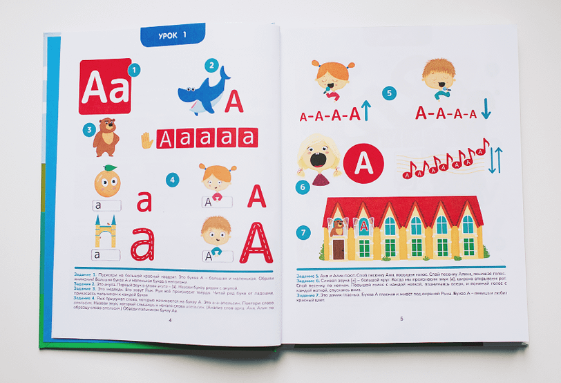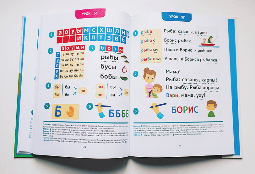 «Букварь» рассчитан на детей от трех лет. В нем 107 подробных уроков с игровыми заданиями и понятными инструкциями для родителей. Обучение построено от простого к сложному: если заниматься в день по 20 минут, то на десятом уроке ребенок прочитает первое слово, а на девятнадцатом — предложение.