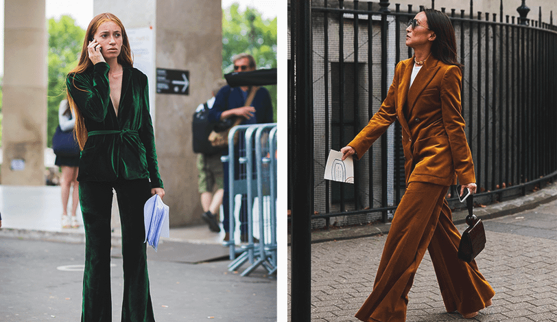 В бархатном костюме в пижамном стиле вполне можно появиться в офисе с не слишком строгим дресс-кодом или на вечеринке, дополнив образ туфлями на шпильке. Еще один вариант офисного лука: пиджак из бархата в сочетании с классическими брюками или юбкой. Он поможет сохранить строгость и добавит образу шика.