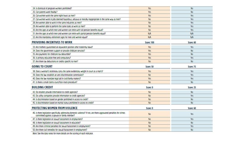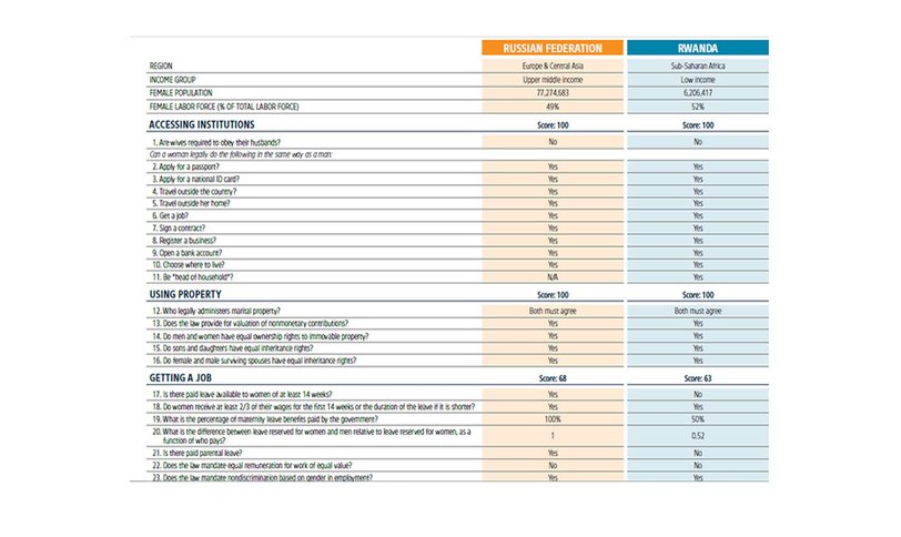 Отчет состоит из вопросов из разных областей, начиная от «совпадают ли условия получения паспорта для женщин и мужчин в стране» и заканчивая обсуждением наказаний за харассмент на рабочем месте.