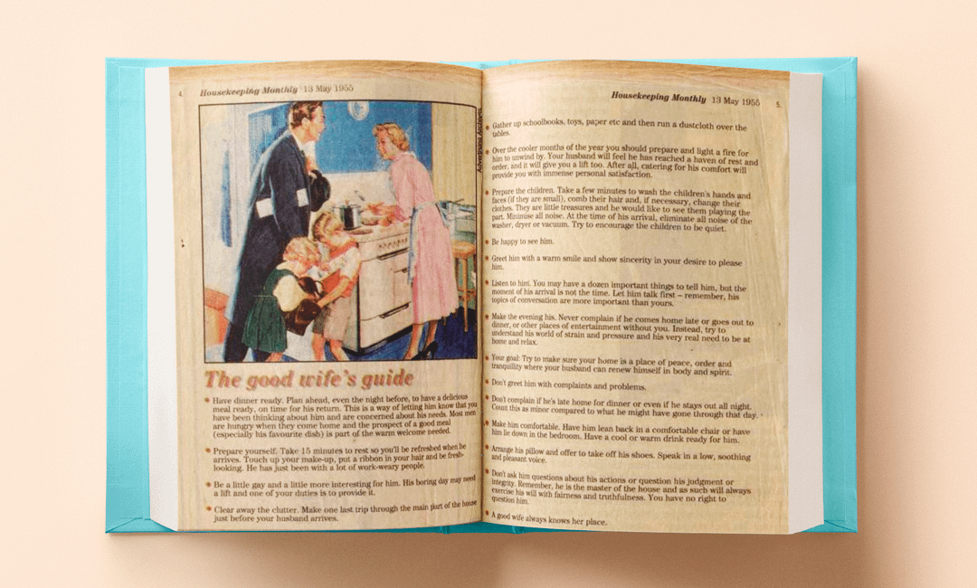 В мае 1955 года популярный американский женский журнал Housekeeping Monthly («Ежемесячник по домашнему хозяйству») опубликовал статью под названием «Руководство для хорошей жены». Советы, которые были в нем приведены, были настолько показательны, что их мгновенно стали перепечатывать в других изданиях и даже добавили в один из учебников о семейной экономике для старшей школы. Если сравнить правила из этого «руководства» со современными тенденциями, то можно заметить, что прогресс не стоит на месте. За 60 лет американские женщины многого добились, так что некоторые из советов уже воспринимаются как шутки. Но некоторые проблемы не решены до сих пор. В Советском Союзе в 50-е годы царило истинно социалистическое равноправие мужчины и женщины в «ячейке общества», так что наши соотечественницы немало посочувствовали бы роли американской жены.