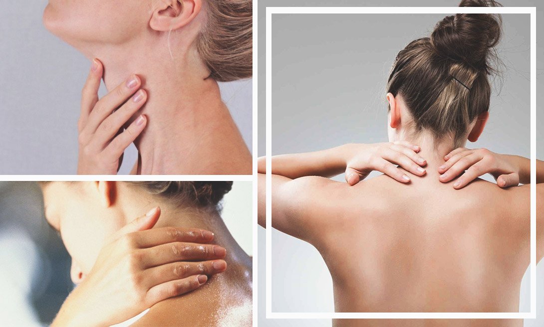 1. Сидя или стоя подними руки чуть выше груди и начни скользить пальцами по задней части шеи от затылка к спине. Повторяй это движение несколько раз. Поочередно наклоняй голову к правому и к левому плечу и продолжай растирать.