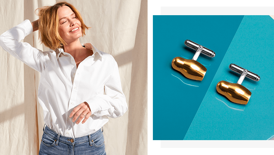 На самом деле запонки — вещь универсальная: их часто носят не только мужчины, но и женщины. Вариант с матрешками выглядит довольно экстравагантно и вполне может быть надет с любым аутфитом, где фигурирует рубашка, но не любая, а только та, в манжетах которой нет пуговиц. Что касается самих запонок, они снабжены Т-образной застежкой, или Bullet Back, которая надежно фиксируется за счет поворота на 90 градусов. Аксессуар доступен в золотом и серебряном исполнении.