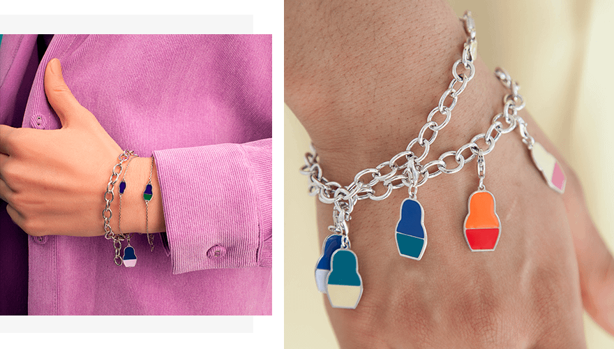 Крупные самодостаточные браслеты-цепи не сдают позиции уже несколько сезонов подряд. Помимо того, что такие украшения просто красивы, они еще и отлично подходят к любому наряду. Что касается ювелирных сочетаний, то носить их можно по‑разному: в одиночку, с одним или несколькими более тонкими браслетами или украсив шармами. В коллекции Matryoshka есть несколько шармов-подвесок в разных цветовых вариациях: от черно-белого до сине-сиреневого и изумрудно-оливкового.