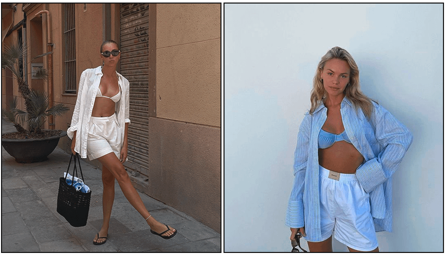 Еще одно идеальное для жаркого лета сочетание — топ-бра с оверсайз рубашкой и однотонными шортами-боксерами с высокой посадкой. И если в городе в таком аутфите может быть некомфортно, то на пляже он точно будет уместен.