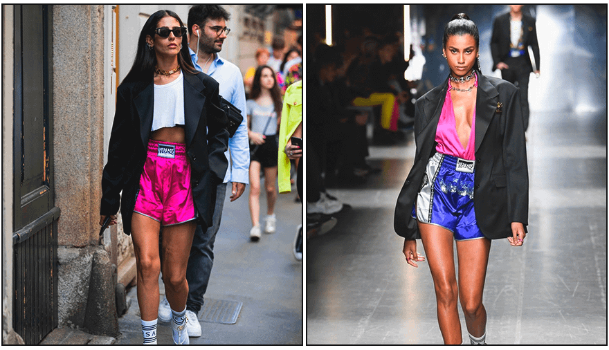 Еще в 2019 году на одном из модных показов Versace на подиуме появились модели в ярких шелковых шортах-боксерах. Завершали образ, как ни странно, базовые классические пиджаки. И вот, спустя 3 года, подобное сочетание получило большую популярность.