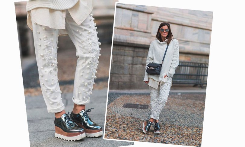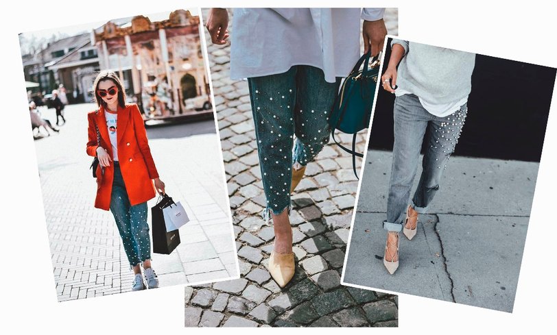 Джинсы, декорированные бусинами, выглядят менее броско, и подобрать к ним гармоничный верх не составит труда. Сделай ставку на расслабленность и элегантную небрежность: комбинируй джинсы с простыми футболками навыпуск или слегка помятыми рубашками, выглядывающими из-под свитера. В качестве обуви можно выбрать мюли, кроссовки или туфли-лодочки нюдовых расцветок.