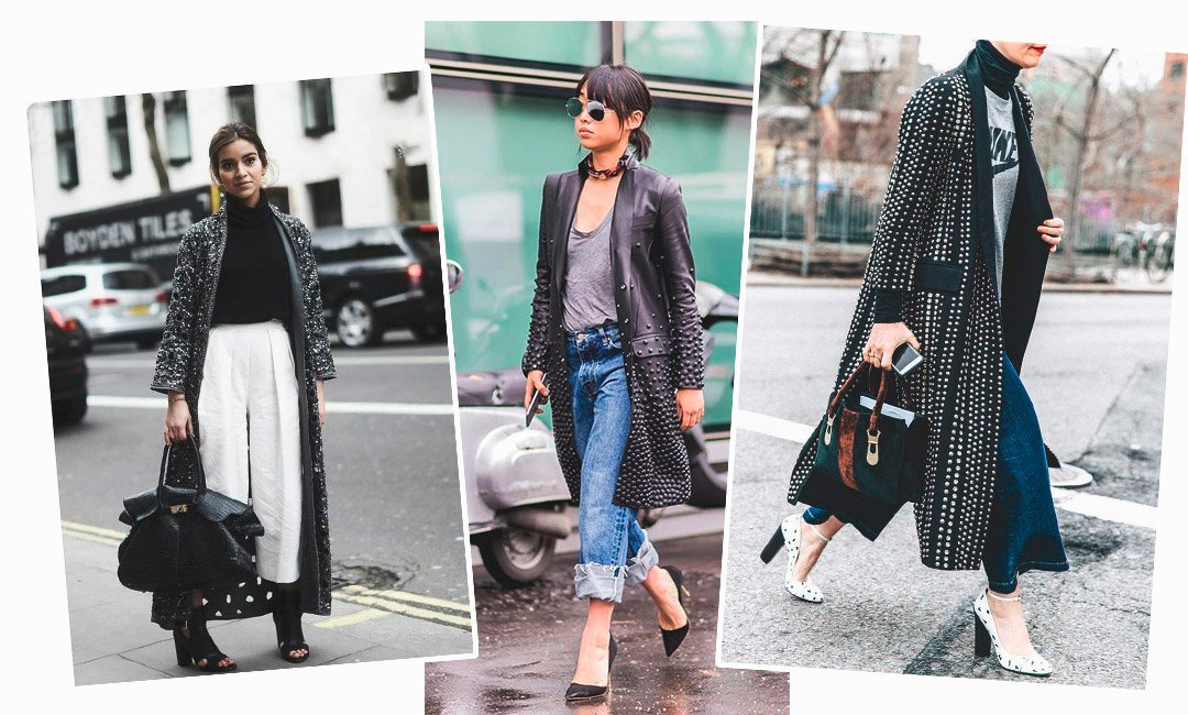 Верхняя одежда со сверкающими стразами станет одним из главных трендов осенне-зимнего сезона. Удачный выбор — пальто или плащ прямого кроя. Чтобы не выглядеть вызывающе, носи такую вещь с базовыми предметами гардероба: простыми джинсами, футболками, платьями-рубашками, кроссовками или туфлями-лодочками.