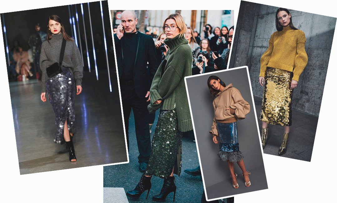 Длинная юбка с пайетками будет смотреться более сдержанно, если разбавить ее лаконичными oversize-вещами. Например, тяжелым вязаным свитером, объемным худи, блузой или рубашкой. Не бойся смелых сочетаний и для завершения образа выбери высокие сапоги с металлическими вставками или остроносые ботильоны в стиле металлик.