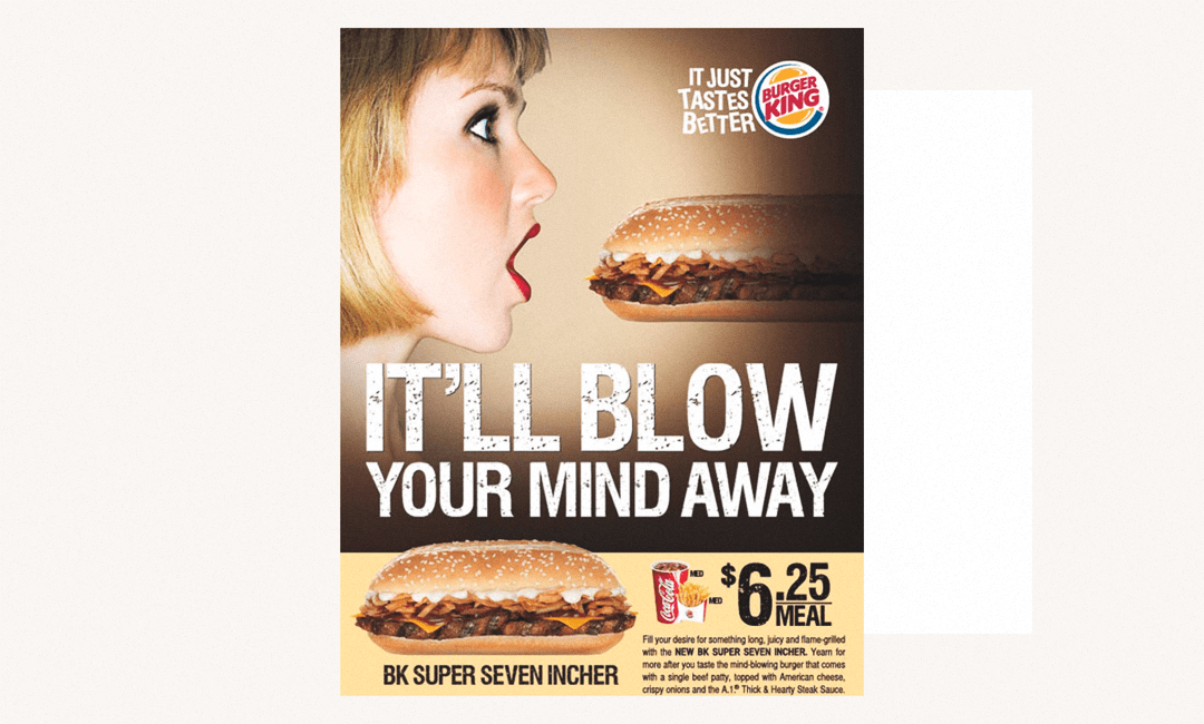 Намеков на секс в крупных компаниях всё-таки предпочитают избегать, оставляя их для вирусной рекламы. Например, закусочная Carl’s Junior долгое время щеголяла лозунгами вроде «Эта грудь нежнее булок» про куриные грудки, с соответствующими изображениями полуобнаженных бюстов и ягодиц рядом с бургерами. «Бургер кинг», известный своими скандальными кампаниями, тоже не преминул использовать такие ассоциации: