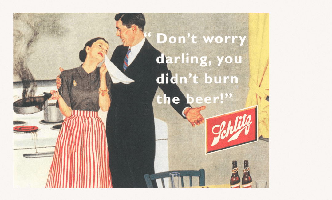 В середине XX века сексистская реклама была нормой. Женщины в ней представали глуповатыми, слабыми и капризными существами, которые годились только для уборки и готовки. Да и то не всегда, если вспомнить рекламу «Не волнуйся, дорогая, зато ты не сожгла пиво». Посредственное ведение домашнего хозяйства могло быть прощено, если девушка была послушной, одевалась так, как нравилось мужу, и ни в коем случае не набирала больше того количества килограммов, которое было продиктовано модными стандартами.
