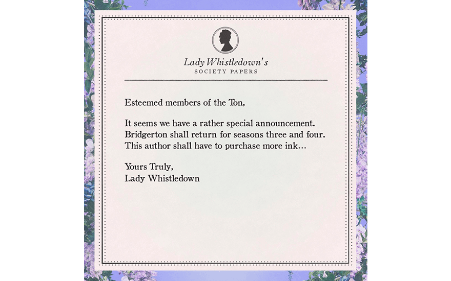 Дата выхода третьего и четвертого сезонов, впрочем, как и второго, пока неизвестна. Однако Deadline утверждает, что новые главы будут сняты по книгам «Предложение джентльмена» и «Романтическая история мистера Бриджертона».