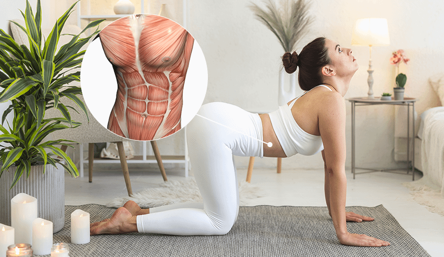 Эта поза йоги помогает расслабить мышцы живота, а заодно поработать над осанкой. Нужно встать на четвереньки и опустить подбородок к груди, выгнув спину дугой. Расслабляй живот и удерживай баланс, перенося вес тела на руки. А затем запрокинь голову вверх и тяни живот, грудь и солнечное сплетение вниз, чтобы спина выгнулась так, будто стараешься удержать ею какой-либо предмет.