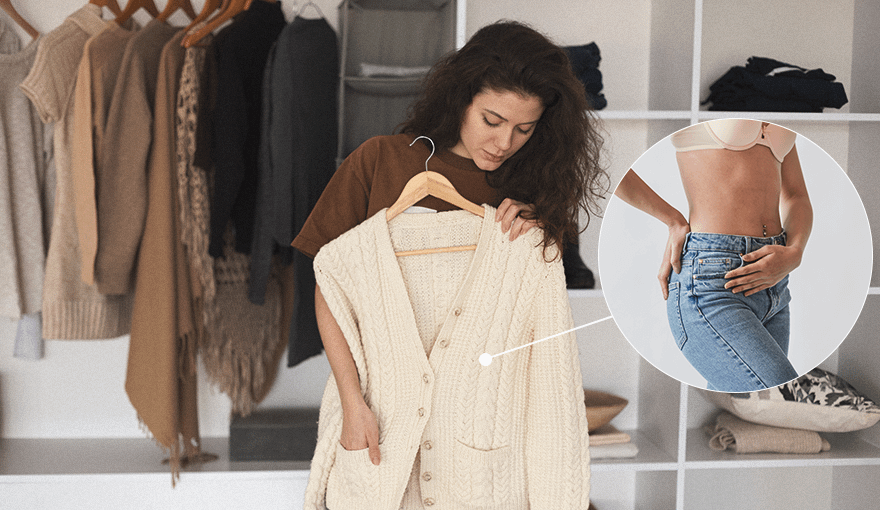 Узкие джинсы, тугие ремни, обтягивающие юбки — лишь часть вещей, которые способствуют привычке втягивать живот. Чтобы от нее избавиться, стоит пересмотреть свой гардероб. Выбирай вещи, которые не будут тесны в талии, присмотрись к новым фасонам, а также подбирай одежду по типу фигуры, чтобы она смотрелась хорошо.
