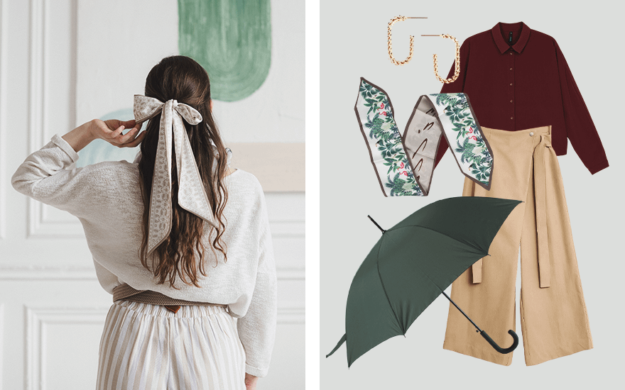 Прогулки открывают большое количество возможностей для экспериментов с образами. Например, мы советуем попробовать использовать шейный аксессуар, как элемент прически: завяжи небрежный низкий хвост и спрячь резинку под красивым платком. Такая деталь добавит динамику в образ. Лучше всего, если цвет или принт платка будет перекликаться с нижней частью одежды — брюками, юбкой или обувью. Наверх можно надеть любую базовую вещь нейтрального цвета, чтобы не перегрузить лук.
