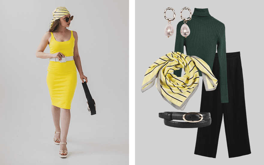 Создать правильный лук и при этом не потерять свою индивидуальность поможет палантин или шелковый платок. Например, ты можешь надеть водолазку с высоким горлом, брюки на высокой талии с тонким ремнем и дополнить образ цветным платком от бренда Russian Look интернет-магазина Goroshek. Или отдать предпочтение классике — выбрать деловой костюм с белой блузой, но разбавить его длинным палантином. Завязать его можно по-разному: накинуть на плечи, перебросить через одно или обвить вокруг шеи.