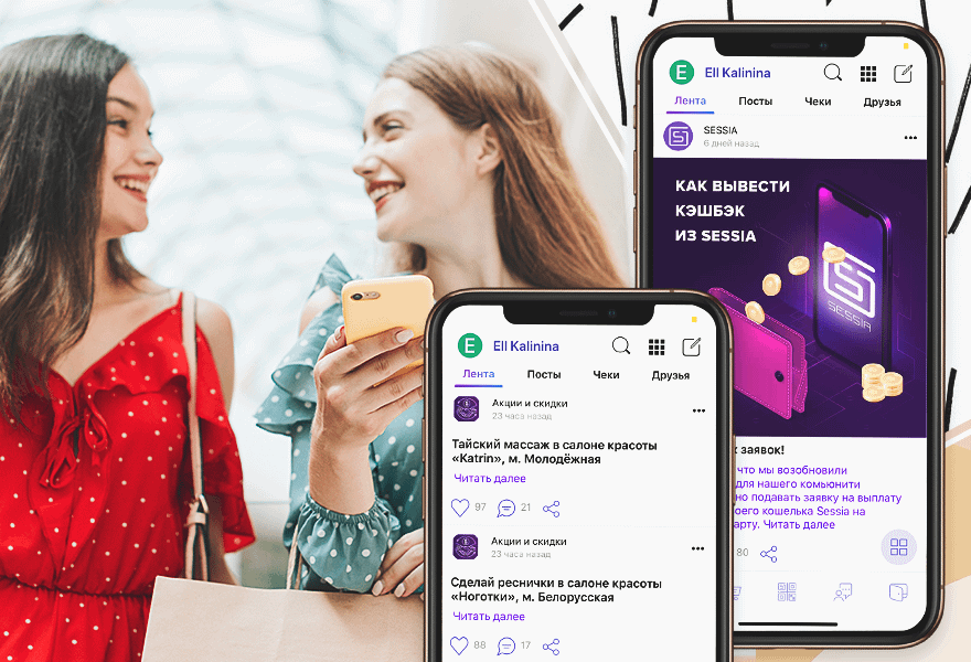Sessia позволяет получать моментальный кэшбэк с каждой покупки у партнеров приложения. Допустим, ты заказала латте в кофейне, бариста приносит тебе чек и сканирует его своим приложением для кафе — тебе начисляется кэшбэк, и новость об этом появляется в ленте как твоя рекомендация.