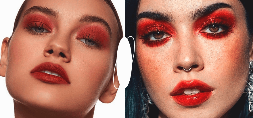 Чтобы повторить его, затонируй губы небольшим количеством консилера. Затем карандашом красного оттенка прорисуй контур и слегка растушуй подушечками пальцев. Нанеси на центр губ помаду и тонкой макияжной кистью растушуй продукты от уголков к середине губ. Результат закрепи плотным прозрачным блеском.