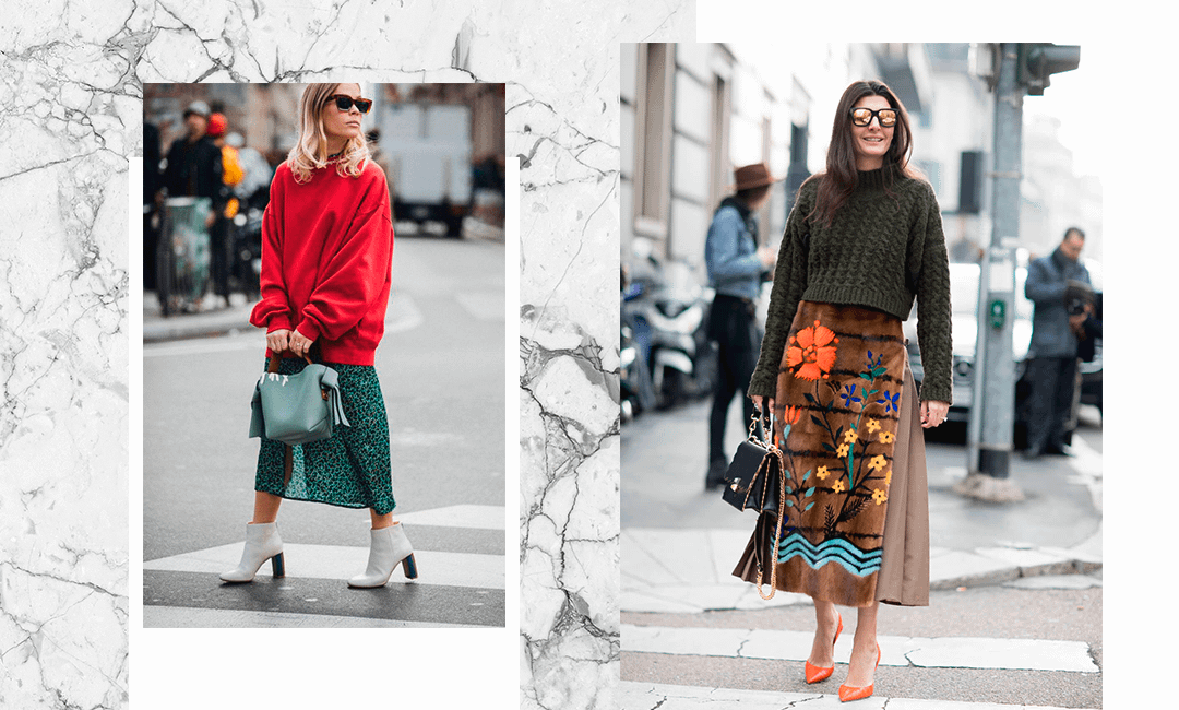 Самый актуальный комплект этой зимы еще рано вынимать из гардероба. Яркий уютный свитер с принтованной юбкой-миди можно носить с любой подходящей под погоду обувью: от полусапожек до любимых кроссовок.