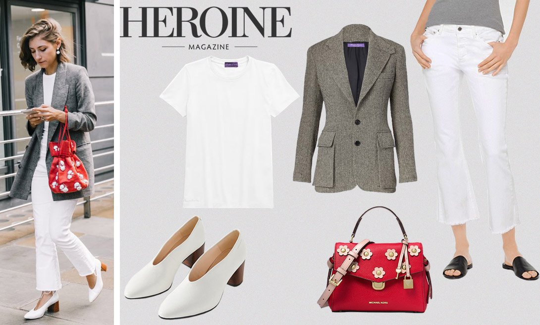 На Дженни белый тотал-лук и яркая винтажная сумка, с помощью которой можно добавить яркости нейтральному образу.
