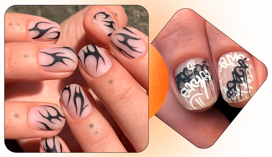 Этот вариант летнего маникюра подойдет, если ты предпочитаешь короткие ногти и любишь готический стиль. Особенно актуальны слайдеры-татуировки в тематике нулевых. Например, это могут быть округлые линии с острыми концами либо надписи в стиле граффити.