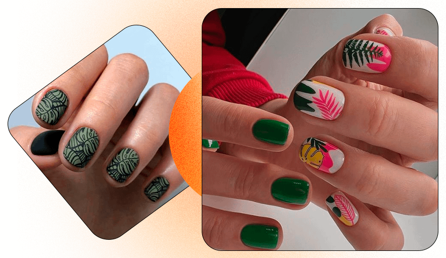 Если собираешься провести отпуск в теплых странах или просто хочешь окружить себя летним вайбом, попроси мастера сделать тебе маникюр с тропическим узором. Это могут быть слайдеры с изображением кокосового дерева, питайи или лиан.