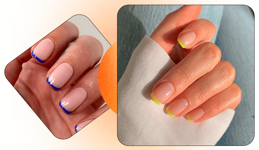 Кстати, цветным можно сделать не только классический френч, но и обратный. В этом случае яркий лак наносится на всю пластину, кроме кончиков ногтей.