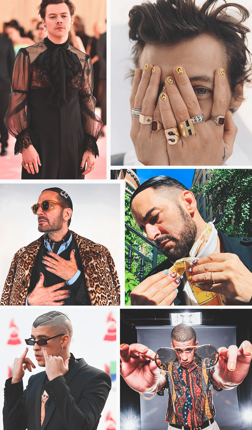 Если 30-40 лет назад яркие ногти у парня вызывали вопросы и ставили под сомнение его маскулинность, то теперь маникюр нужен для того, чтобы ощутить гармонию тела и духа. Гендерные стандарты в дизайне и образах постепенно сходят на нет, и потому звезды, а вслед за ними и фанаты могут позволить себе яркие детали. В 2019 году Гарри Стайлс появился на Met Gala со светло-бирюзовыми ногтями, нередко акцент на руках делал и Марк Джейкобс. Пуэрториканский рэпер Bad Bunny, известный любовью к цветным ногтям, так высказался о тренде: