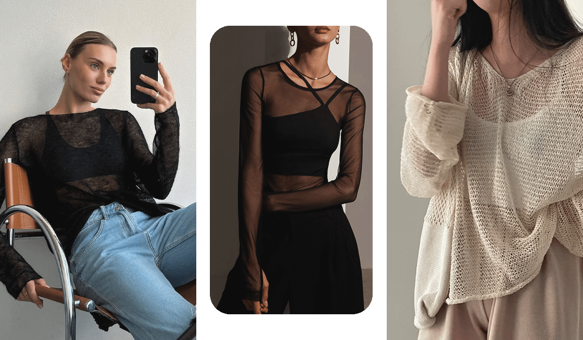 Еще один тренд родом из 90-х — прозрачные лонгсливы и топы. Модные инфлюэнсеры обратили на них внимание еще в 2021 году, но с тех пор популярность одежды только увеличивается. Одни предпочитают лонги из синтетической ткани, другие — из тонкой шерсти. Особенно актуальны однотонные модели.