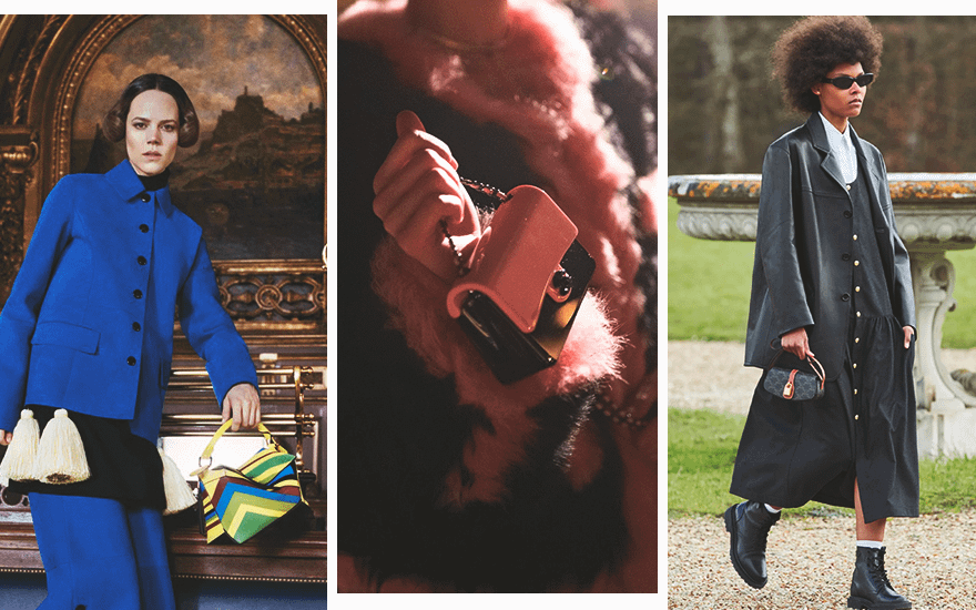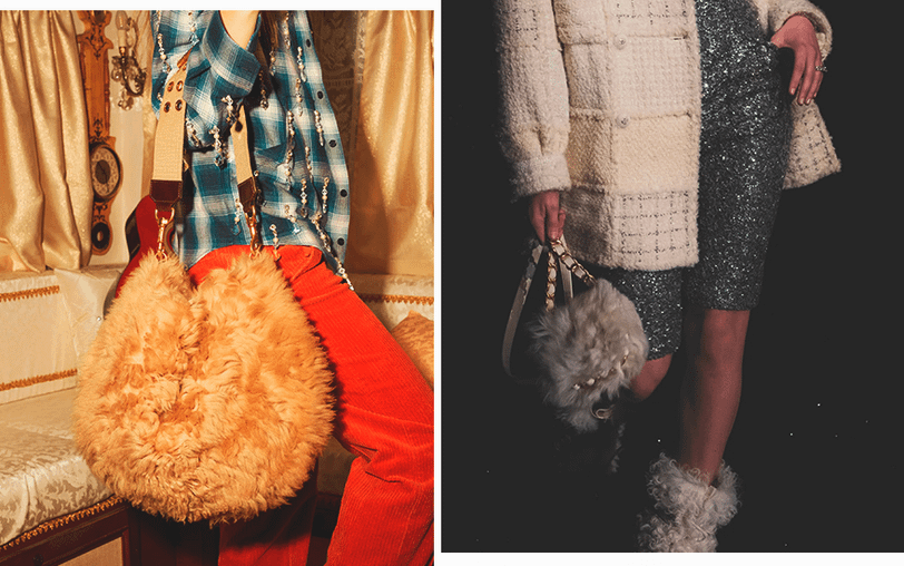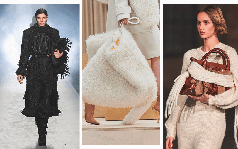 Не менее популярными в предстоящем сезоне будут текстурные сумки, словно созданные для того, чтобы быть одним из популярных изобретений для снятия стресса. Некоторые модные дома и вовсе подготовили модели, способные напомнить сенсорные ощущения от прикосновения к любимому мягкому ковру в гостиной или поглаживания любимого питомца. Пушистые, с бахромой, ворсом и трикотажными деталями — разнообразие таких сумок не ограничено. Примеры использования текстурных сумок в образе можно увидеть у Miu Miu, Alberta Feretti, Burberry, Chloe и Chanel.