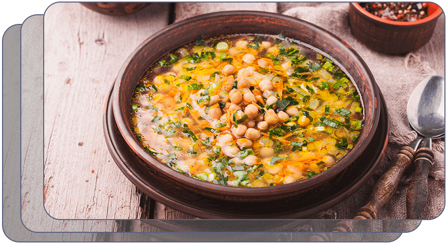 Как приготовить: нут замочи на ночь, а затем слей воду и отвари. Из курицы свари прозрачный бульон, добавив в него соль и лавровый лист. Достань мясо и нарежь его или раздели на волокна.
