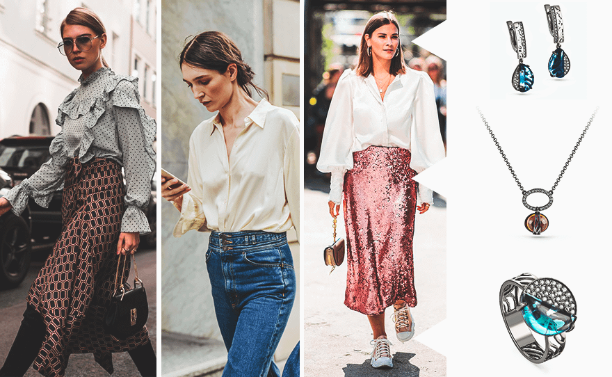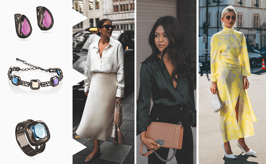 С чем носить: особенно красиво коллекция украшений «Мисти» будет смотреться с одеждой из блестящей струящейся ткани — топами, рубашками, костюмами и платьями из шелка, атласа или сатина.