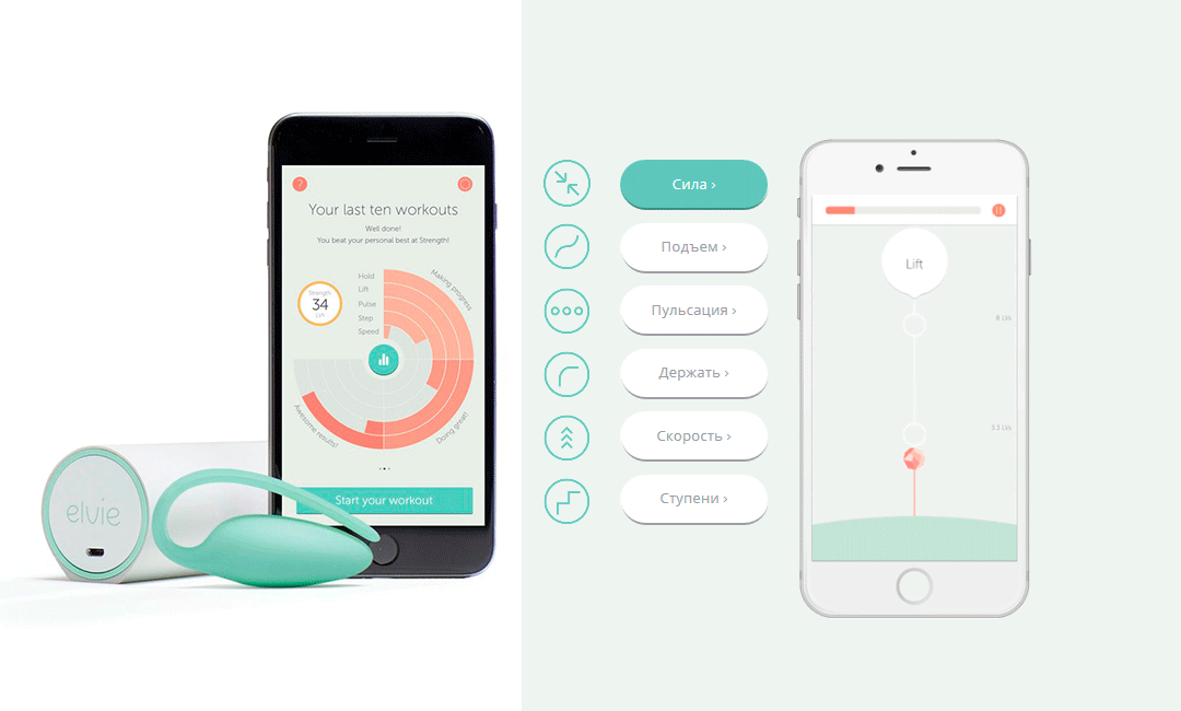 Разработчики ELVIE запатентовали новый способ измерения силы нажатия и движения. Благодаря ему ты можешь визуализировать работу своих интимных мышц и корректировать технику. Во время сжатия тренажера жемчужина на экране смартфона поднимается вверх. Дальше — просто выполняй упражнения, которые отображаются на твоем телефоне.