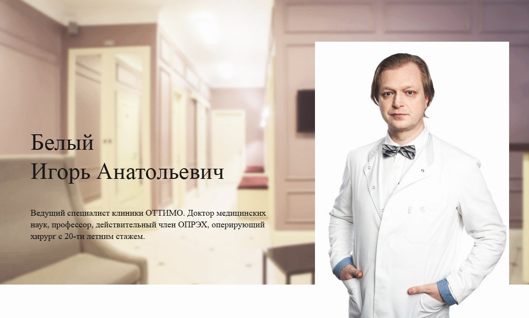 Решившись на операцию, стоит подобрать хорошего хирурга. Белый Игорь Анатольевич — ведущий специалист клиники эстетической медицины «Оттимо», доктор медицинских наук, оперирующий хирург с 20-летним стажем. Для каждого пациента доктор разрабатывает индивидуальный план операции, а для тех, кто занимается спортом, корректирует систему тренировок, поскольку существуют ограничения по нагрузке на грудные мышцы в зависимости от типа установленных имплантатов.